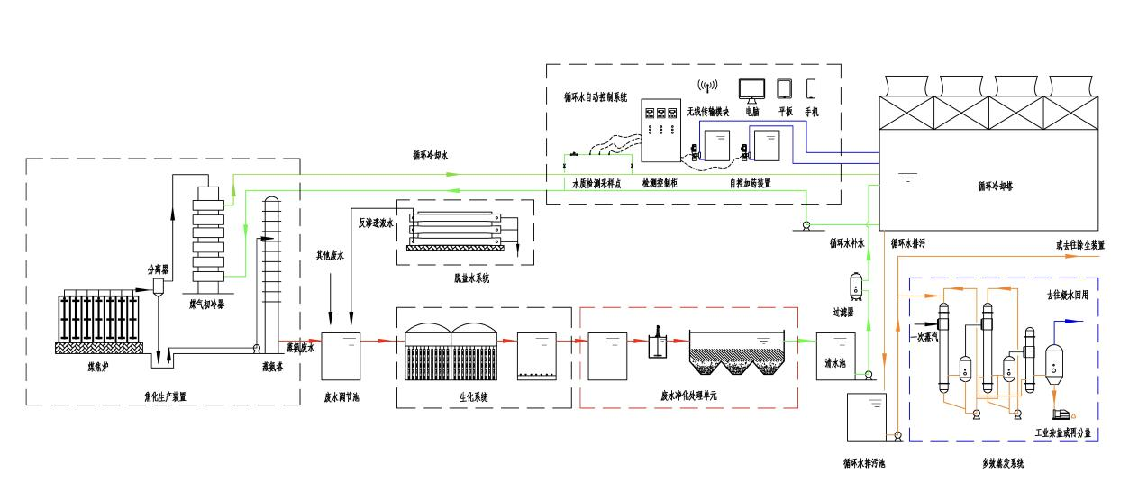 案例二 山東某焦化企業(yè)產(chǎn)能年產(chǎn)120萬噸焦炭,其焦化生化廢水量為2000-2500噸/天。受環(huán)保影響,廢水無法外排,需要短平快的實現(xiàn)廢水"零排放"。按著"一廠一策"的原則,我公司提供了技術方案,在生化廢水二沉池后增加了一體化凈化裝置,投加專用凈水劑,使水質(zhì)達到循環(huán)水進水指標。循環(huán)水系統(tǒng)包括凈化系統(tǒng)6000m3/h、制冷系統(tǒng)3000m3/h、干熄焦系統(tǒng)7300m3/h,投加我公司專利產(chǎn)品高鹽阻垢緩蝕劑,采取自然pH堿性運行方案,使循環(huán)水濃縮倍數(shù)控制在8-10,循環(huán)水冬季不用排污,夏季少量高鹽水回用到除塵系統(tǒng),維持了水的平衡和鹽的平衡。由于沒有采用雙膜處理工藝,省去了大筆建設投資,建設周期短,及時解決了客戶廢水無法外排問題,同時每年可節(jié)約新鮮水75萬噸。